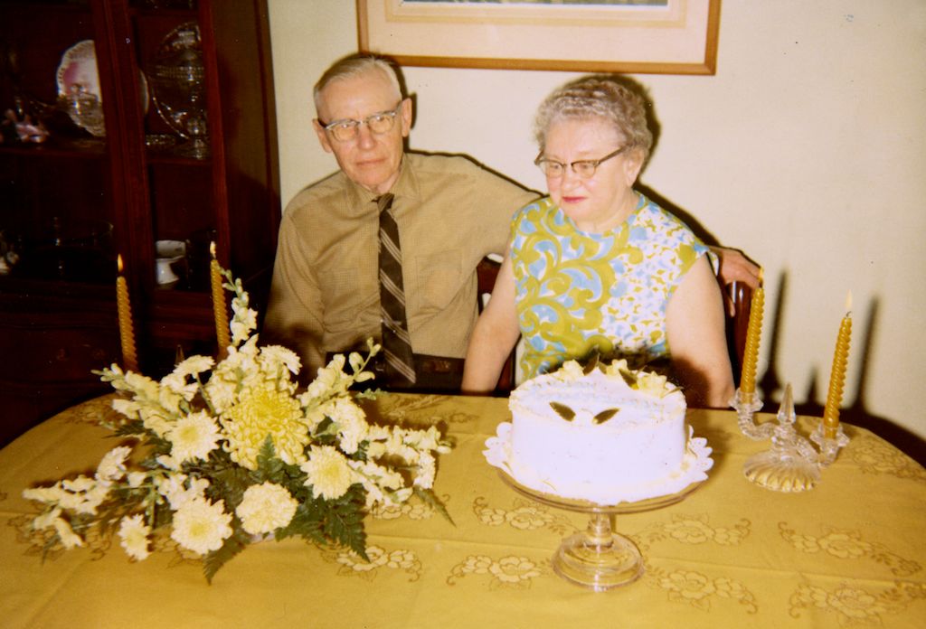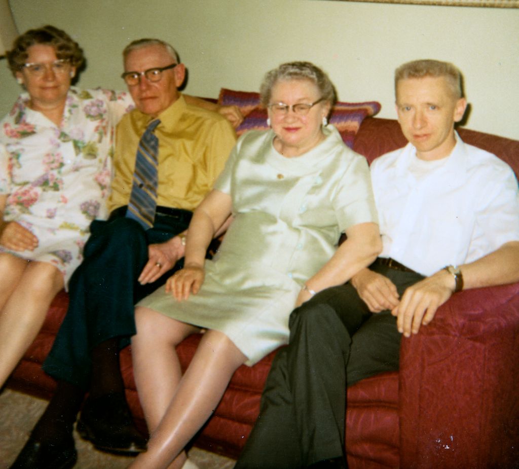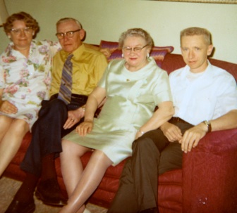 On the 5th of June, 1970, Carl and Esther Krieser celebrated their 50th wedding anniversary with their family at their daughter Ruth’s home in St. Louis, Missouri. The upper photo shows the anniversary couple with all the candles lit ready to celebrate. The cake is waiting to be cut and eaten by their hungry descendants and the lovely floral bouquet seems to be beckoning for all to do just that. It was a lovely occasion. The lower photo is of the celebrated couple with their two children, Ruth Margaret (Krieser) Kumbier and Carl Fredric Krieser. Mother Krieser has a lovely new dress on for the occasion. She looks so lovely in that pastel green with her hair done so beautifully. She loved to dress up and look her best whenever she went out and this special occasion was no exception.