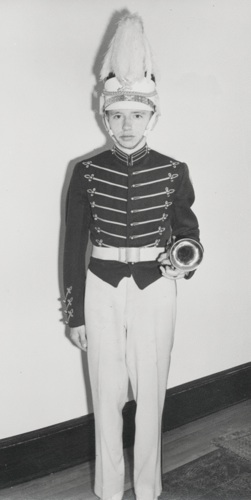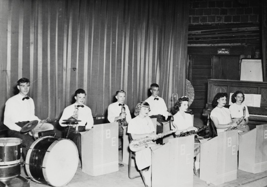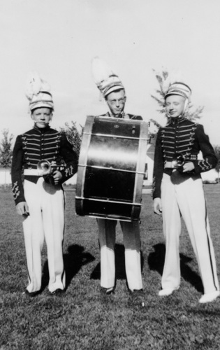 Robert Edward Wulterkins was a Kimberly High School student who came from Combined Locks, a little town right next to Kimberly. When he started his band he didn’t want to use that long, complicated name, so in the tradition of the big bands, he decided to simplify it to the Bobby Edwards Band. He might have given great consideration to naming his band but, in reality, nobody called him either Robert of Bobby. Everybody called him “Skinks”. How he got that nickname is anybody’s guess. Carl played in his band for his four years of high school from 9th grade on, but it was not a high school band. They played school dances and wedding dances from Kimberly, Little Chute, Combined Locks and beyond--usually on weekends. All of the members except Carl were from Combined Locks but the boys lived on the side toward Kimberly so they went to Kimberly High School, and the girls were all from the other side of town and they attended Kaukauna High. In the photo (left to right, Back row): Marvin Schumacher (called Muzz) on the drums, “Skinks” Wulterkins on trumpet, Carl Krieser on trumpet, Clyde Schumacher (nicknamed Shoos) on trombone. The four girls sit on the front row but Carl can’t remember any of their names because they weren’t part of the Kimberly High group. The first girl played tenor sax, the next two both had alto saxes and the last one played the piano. This provided spending money throughout the high school years.