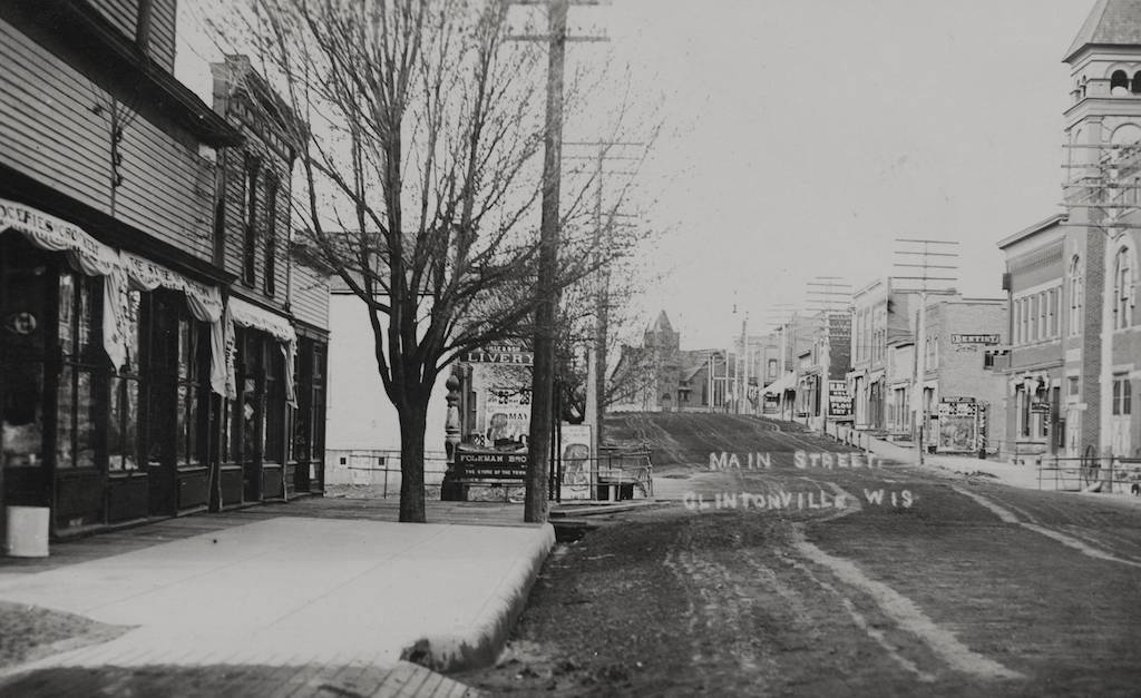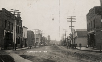 Both of these family post cards are of Clintonville’s Main Street. Neither is dated, but they are probably from the early 1900s. The upper one shows a busy street with many vehicles on it - if horse and buggies can be called vehicles. You can see all of the hitching posts along the curbs. It’s not clear enough to distinguish if there are any automobiles farther down the road or not. The bottom one displays an empty street. Maybe it was taken early in the morning. From the towers, they appear to be taken from opposite ends of the street.