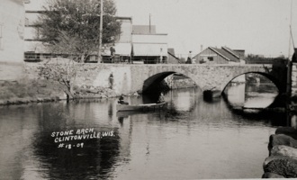 The top card is addressed to Laura Ehrgott at the Wisconsin Veterans Home in Waupaca, from Eva. Taken on Booster Day, a local holiday that sported such events as a parade down Main Street in the morning, a great picnic where they carved an ox roast, and this 4-Wheel Drive Great Auto Test. 4-Wheel Drive is located in Clintonville and is one of its main industries. The bottom card shows the lovely stone-arch bridge over the Pigeon River at Main Street, dated 1909. It didn’t survive the flood of 1912 (read about it next).