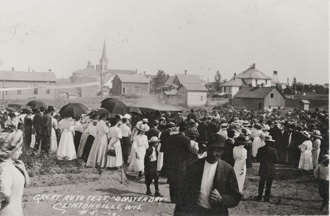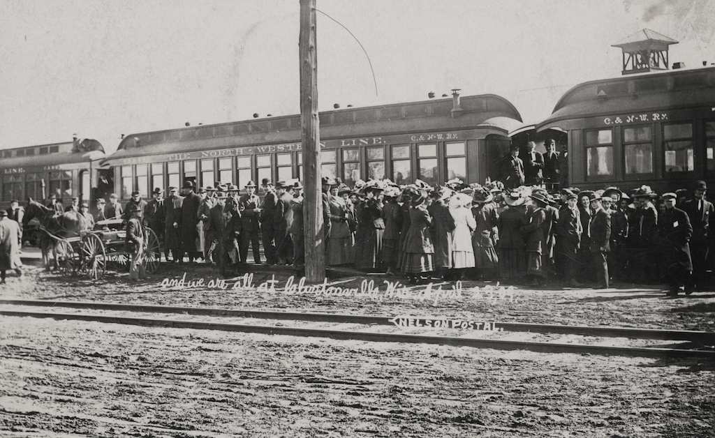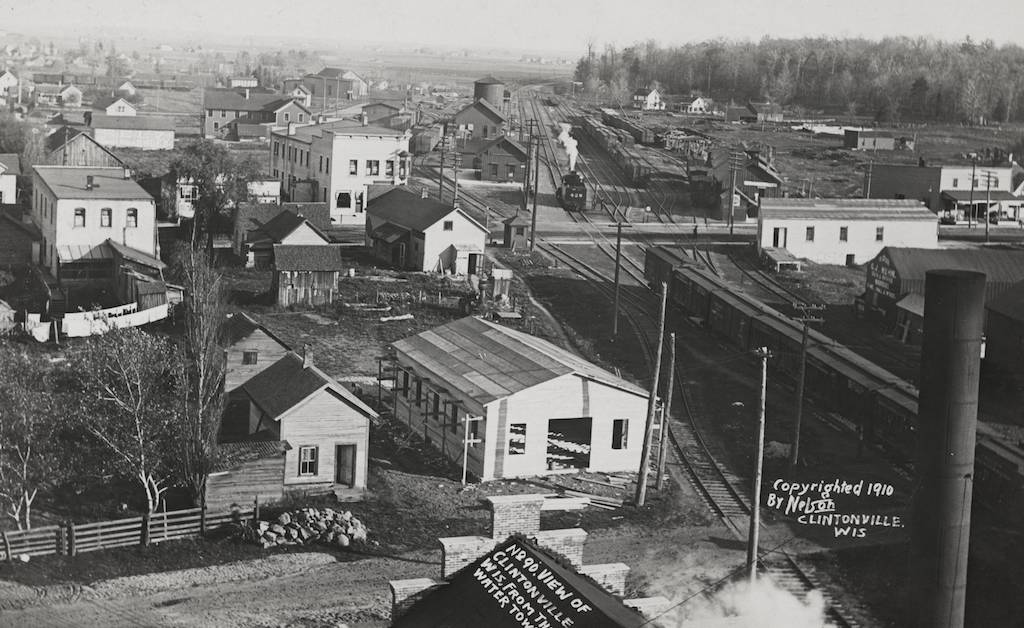 These two post cards show the Chicago-Northwestern Depot in Clintonville, Wisconsin, a place that Carl R. Krieser probably saw a lot of as he courted Esther Ruth. He worked at the Northwestern Depot in Marion. The top one shows a platform view. The bottom one is an aerial view that was taken from the water tower. The card is from Louise Ehrgott to her sister, Laura Ehrgott in Neenah, both cousins of the Ruth girls. She said, “My, such a mob at the depot.” The tracks crossed Clintonville’s Main Street at this point. A small railroad signal hut can be seen right in the center of the photo. It gave the signalman a small place of refuge from the weather, whether rain or shine.