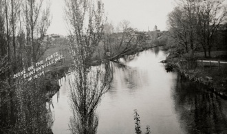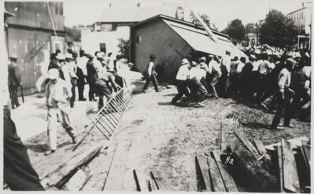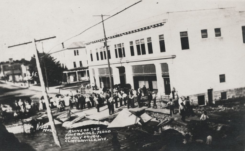 Here are two post cards that show the ruins and aftermath of the Great Flood of July 24, 1912. They had to dynamite the bridge to keep the buildings and trash that came floating down the river from creating a dam and flooding the town. Even with that, the water flowed over into the streets and threatened to come over the sidewalks. The postcard is from Alma Ruth to her sister Elizabeth Feise. Alma said, “This is the way the bridge looks now. The footbridge is on Folkman’s side. The water was up to the Ward house. Love, Alma”