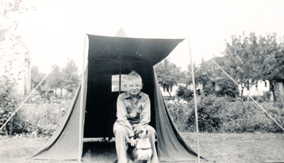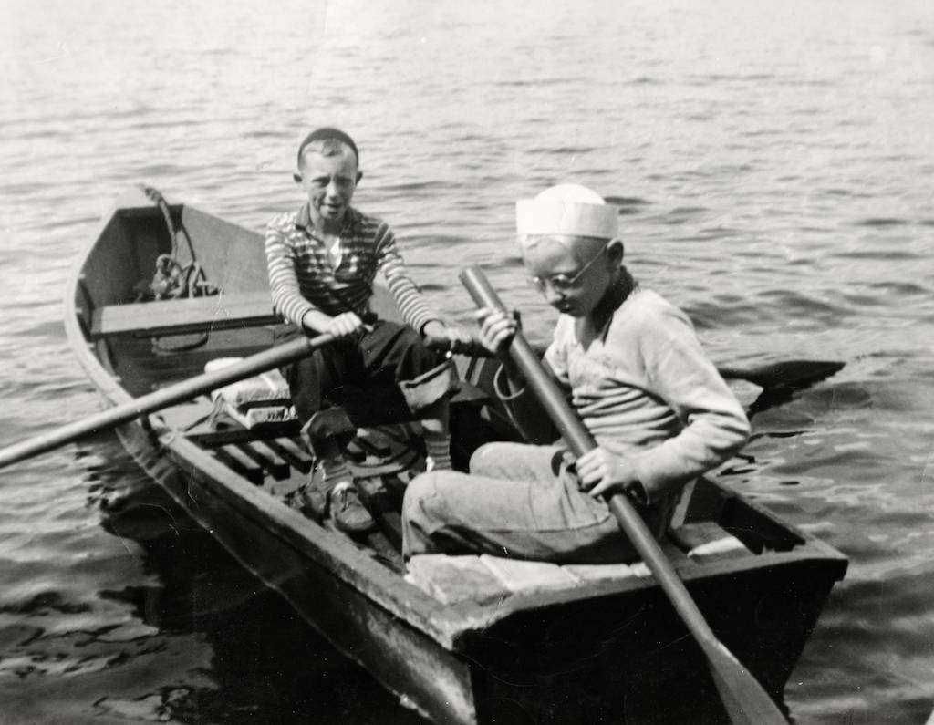 Carl R. Krieser was train dispatching at Antigo, Wisconsin during this summer (1939 or 1940). Because of the seasonal ore operations in Northern Wisconsin, they needed more train dispatchers on that end of the line during the summer months. One of the other dispatchers had a cabin on Pelican Lake that wasn’t being used that summer so Carl Senior rented it for the family. Pelican Lake wasn’t far from Antigo and he could commute that distance. From the following stories, it appears that Junior might have needed a father’s guiding hand at that age. The photo shows John McElroy with Junior. He was a good friend from Kimberly. John had a big collection of paper model airplanes that he had made. When his mother decided too many had been collected they would take them to Carl’s garage roof, set them on fire and sail them into the back yard. (Not a good idea kids!) Good thing they didn’t burn the house down, as the garage was attached. John had come to stay with the Kriesers for a week that summer. John is shown rowing and Junior has an extra oar that he is trying to use as a make-shift tiller. After John left, Junior hit upon a very creative idea to make life easier for him in his exploring adventures. Rowing across the lake took more hard effort than he cared to expend so he decided to convert this old rowboat into a sailboat. He had found an old sail under the cottage, so he tied it to some kind of a pole and jerry-rigged the sail onto it. He wedged the pole against the front seat of the boat with some rocks and tied it in as securely as he could. Then he took off across the lake in this Mickey Mouse contraption, again using the ore as a tiller. He was pretty proud of his ingenuity--at first. There was a good wind blowing at his back so he sailed right across the lake in very good time and with very little effort. The problem came in getting back to the cottage. There was no dagger board in this home-made contraption so he couldn’t tack back into the wind. He had to take the sail down and row back, hugging the shoreline because the wind was so strong that he couldn’t row directly into it. Pelican Lake can get very choppy in the wind, and it was a lot farther and longer hugging the shore all the way home than it had been going with the wind straight across the lake. He was one pooped puppy when he got home. He quietly returned the sail under the cottage and never bothered to mention the incident to his mother, at least not until years later when they could laugh about it. Just as well, perhaps. It might have saved her a few grey hairs at the time.