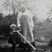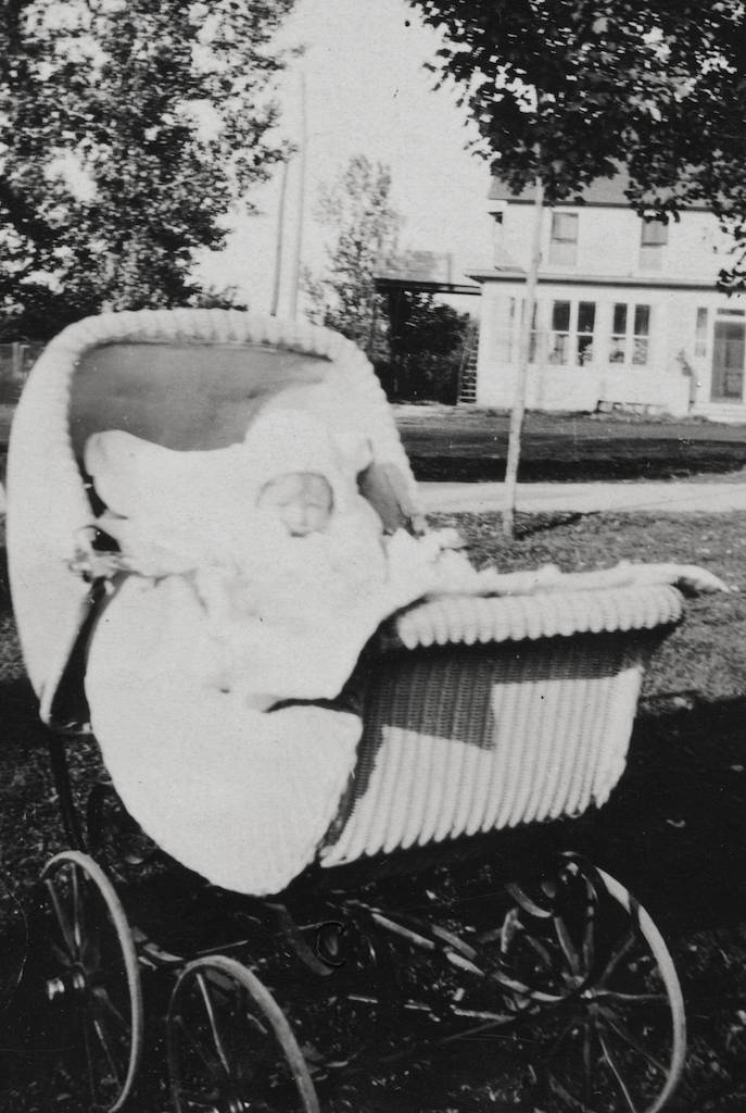 BOTTOM CENTER: This photo was also taken about 1921. Ruthie is in the buggy. It was a classic in its day, with an adjustable hood for shade and a drop-down footrest to make it a stroller for when she is big enough to sit up in it.