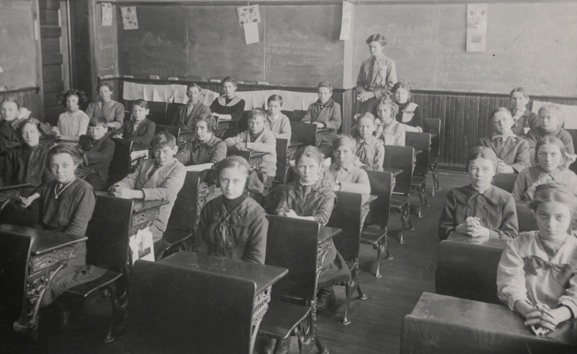 Esther’s 7th grade class photo. Esther is front and center. This was probably about 1911 when she was 13 years old. It was Miss Clark’s class. Look at Esther’s huge bows on either side of her overhead braids. Miss Clark stands at the back of the class. There is quite a lack of visual aids.