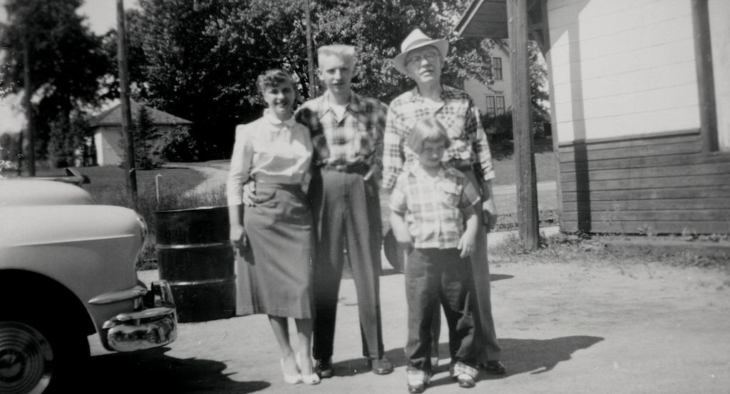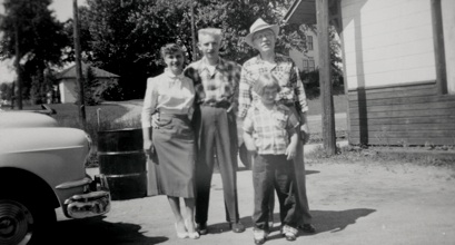UPPER: I’m standing with Carl, Dad Krieser and Sharon Kumbier, Ruth’s oldest daughter in this photo. The Hortonville depot is on the right side and Dad Krieser’s car (naturally, an Oldsmobile) on the left. Mother Krieser probably took the picture.