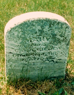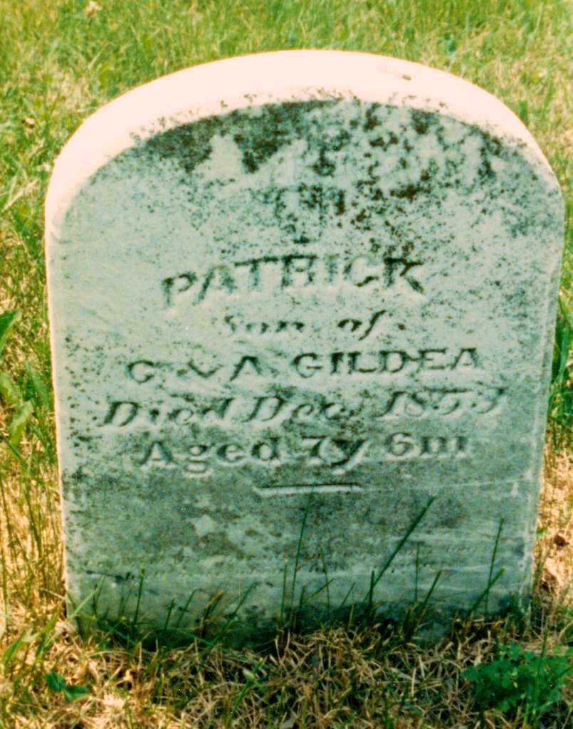 BELOW: The headstones of two of their children in St. John Cemetery, Summitville, Ohio read as follows: Patrick, son of C & A Gildea, died Dec. 1853, aged 7 y, 6 m; Mary, daughter of C & A Gildea, died Sept. 1853, aged 1 y (months unreadable because of a cracked stone).