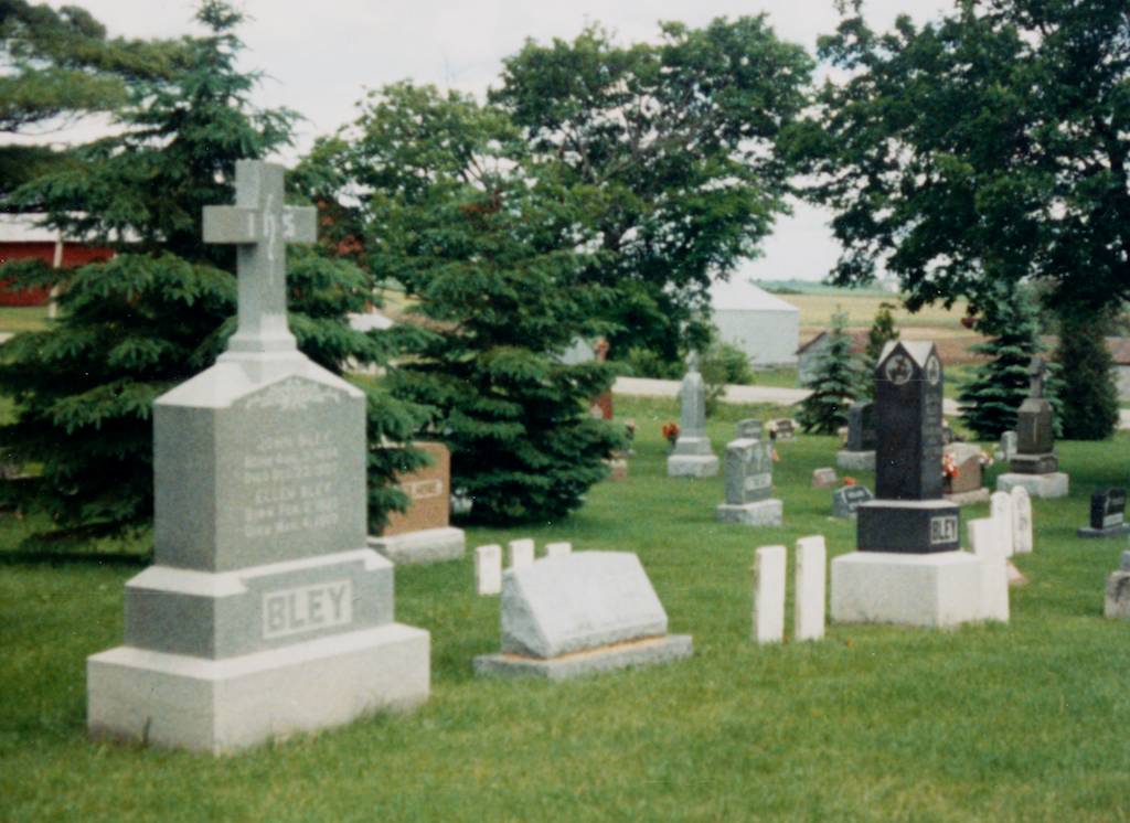 The five small, white stones among the monuments in the Bley family plot are those of John and Patrick Cannon’s children. The three in the back are for John’s family and the two in the foreground belong to Patrick’s family. The cholera epidemic in Outagamie County, Wisconsin turned out to be more deadly for the family than the diphtheria epidemic in Ohio. Their grandmother’s headstone is just to the right of the dark gray Bley marker. The large, light gray one on the left is the stone of John and Ellen (Cannon) Bley. Ellen was a daughter of James an Mary (Lyons) Cannon. The large dark gray monument toward the right belongs to their daughter, Ellen Bley. James and Mary Cannon’s oldest daughter, Anna (Cannon) Killday. is buried in front of her mother but not seen in this picture.