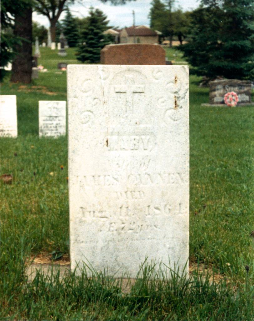 Most of the James Cannon family emigrated from County Donegal, Ireland to Columbiana County, Ohio in the early 1850s after the Great Potato Famine in Ireland. After losing two of their children and two grandchildren in Ohio, probably due to an epidemic of diphtheria that swept through the Summitville, Ohio area where they lived at that time, they moved to Wisconsin, settling first in Dodge County by his brother, Denis, and then in Outagamie County, where James and his wife, Mary (Lyons) Cannon, died in their later years. The above picture shows the gravestone of Mary (Lyons) Cannon. She is buried in the St. Edward Catholic Parish Cemetery, Mackville, Outagamie County, Wisconsin, where they were members. The inscription says: Mary, the wife of James Cannen, died Aug. 11, 1864, age 72 yrs. She would have been born about 1792. There is no stone or death record for her husband, James, who died sometime after 1870.