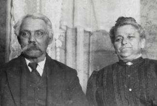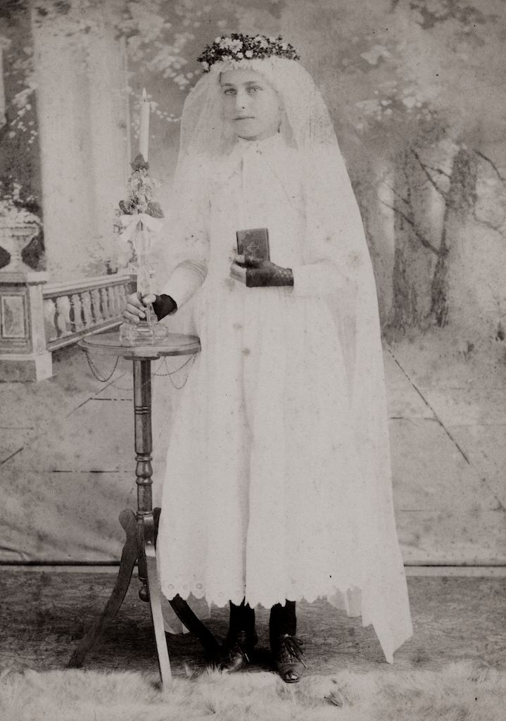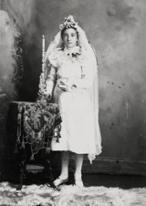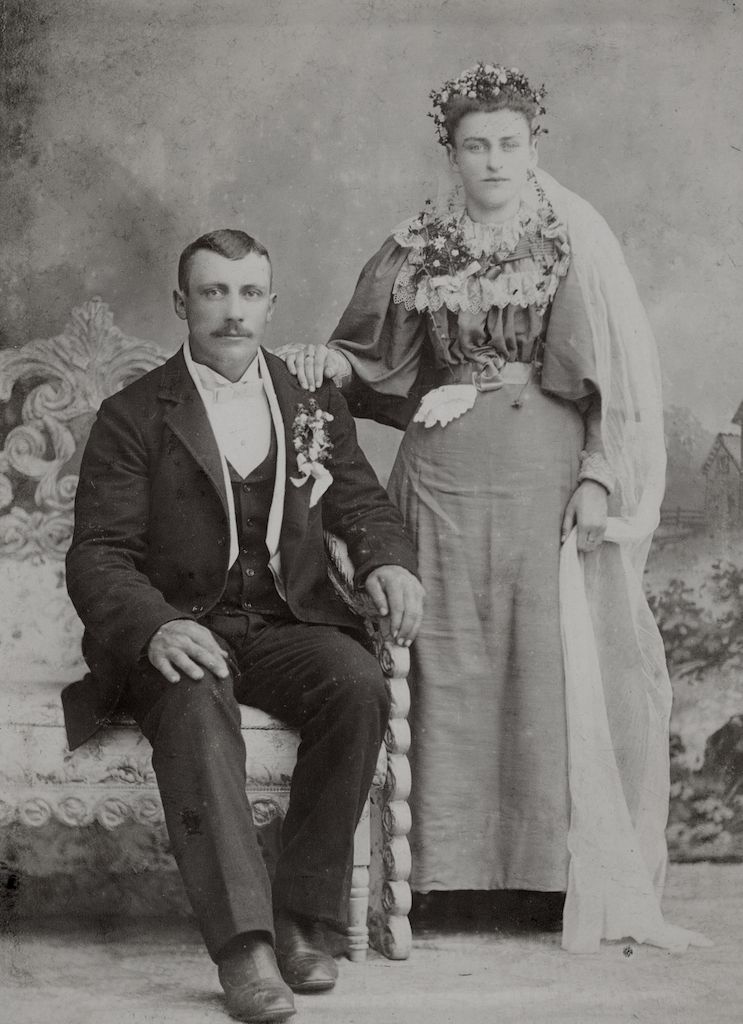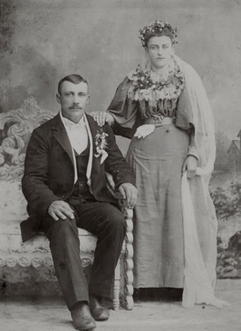 Anna was a very young widow after George died. She then married George Feavel. What a lovely wedding photo this is. Her lovely lace-trimmed dress, handkerchief and veil are beautifully accented by her exquisite floral corsage and crown. George’s boutonniere is made of the same delicate flowers.