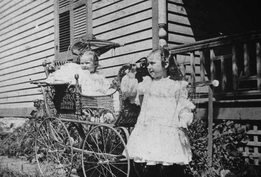 This picture of Anna (Haas) Krause’s two daughters also gives us a good view of their wonderful old parasol perambulator. Margaret, Anna’s younger daughter, looks very comfortable propped up with a fluffy, lace-trimmed pillow behind her. Mae’s white dress is generously trimmed with lace. It has wide lace ruffles bordering the intricate bodice and an especially generous lace ruffle on the upper sleeves. It looks like she has shiny black boots on. The parasol is closed on the baby carriage but it is clearly visible above Margaret’s head. The body of the carriage is constructed in an ornate wicker design and is styled like a sleigh. It has large, bicycle-style wheels with solid rubber tires, making it a much higher baby buggy than we are used to. It would have been disastrous if a child ever fell out of it. Mayme is standing with the buggy on an old board walk that ran along the side of the house. Board walks were very common in that day. They were often slightly elevated to keep clear of the mud. The shutters on the window behind them are closed but one of the louvered panels is propped open to let a little air through. The deeply lathed corner post, the interestingly patterned railing and lattice work covering the crawl space under the porch are all the details that added charm and dignity to the home. It gives us a rare look at some details of a by-gone era.
