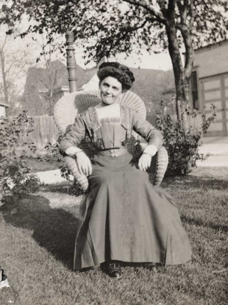 Mayme was the oldest of the Ruth girls. Judging from her clothes and pompadour hairdo, these photos appear to have been taken about 1910. She was working in Milwaukee’s 16th ward for Charles and Barbara Mueller as a servant then. It isn’t known if these photos were taken in Milwaukee or when she went back to Clintonville for a visit. The upper photo shows her with a huge basket full of gorgeous flowers. As well as her lovely dress she also wore spatterdashes, commonly called spats, covering her shoes. In the lower left photo she wears a lovely hand-embroidered dress with a hat over her pompadour hairstyle. Smaller hats were just starting to gain popularity in 1910 and they were an integrated and complementary part of the hairstyle. In the lower right photo, she sits on a lovely wicker chair, very popular at that time. Her lovely pompadour hairdo can be seen very well in this photo. If this 1910 date is correct, Mayme would have been about 31 years at this time. She was a very pretty lady.
