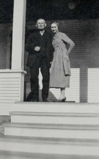 Gustav Ruth stands on the porch with his youngest daughter, Esther. The photo appears to have been taken about 1918 to 1920, shortly before his death. Esther was born October 17, 1898, the only child of his second marriage to Bertha (Ziebell) Rosnow.