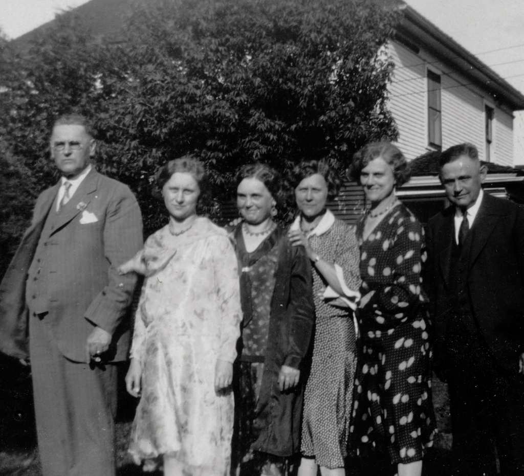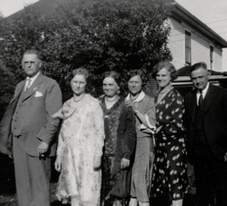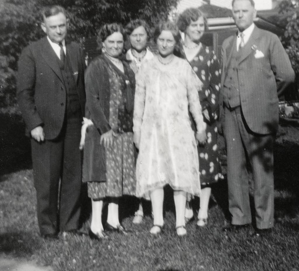 BOTTOM RIGHT: Fred, Esther, Mayme, Alma, Elizabeth and Aud. Esther’s son Carl Krieser was born 24 April 1929. There’s no snow on the ground in the photo so she’s close to delivering and the finger waive hairdo’s were “in” then.