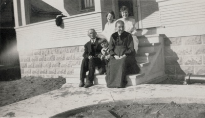TOP: Gustav and Bertha Ruth sit on the top steps with their children and grandchildren. Clara (Ruth) Brady and Alma Ruth sit on the left of the next step with Elizabeth (Ruth) Feise and Fred Emil Ruth (all children of Gustav) on the right. Fred’s twin daughters, Myma and Mildred Ruth, sit in the middle of the next step. Marie (Trier) Ruth (Aud Ruth’s wife) sits on the left of the lower step next to Mayme Ruth, Esther (Ruth) Krieser, little Karl R. Feise (son of Elizabeth), and finally Adolph (Aud) Ruth.