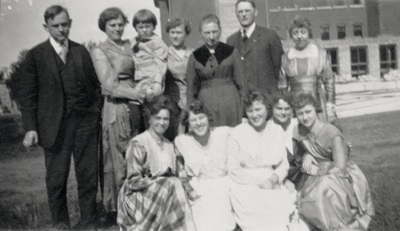 BOTTOM: Standing are Alma, Bertha (step-mother who virtually raised the family), Elizabeth, Fred and Aud with his wife Marie. Sitting are Mayme, Myma and Mildred (Fred’s twin daughters), Clara, Karl Feise and Esther. Elizabeth was only 7 when Gustav (a widower) married Bertha, so she raised all of the girls. Even the boys called her Mother Ruth. They never considered her their stepmother, nor did they consider Esther a stepsister. They were all just one big family. Bertha was a widow when her parents called her home from Oshkosh, Wisconsin to arrange a marriage with Gustav and she complied. Gustav needed a good wife to raise all his children. Although at first it was a marriage of convenience, not love, she did a wonderful job in raising the family. Mixed families of today could well take note of this.