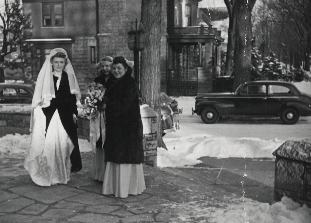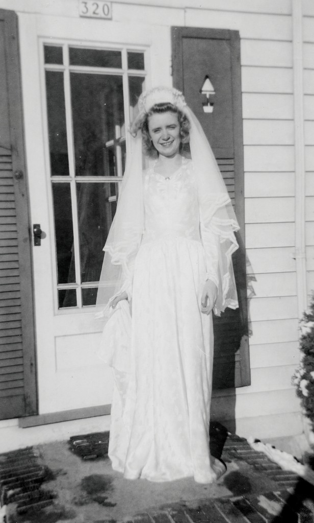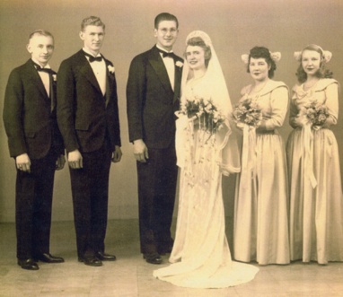 LEFT TO RIGHT: Carl F. Krieser, Ruth’s brother; Robert Kumbier, Leroy’s brother; Leroy and Ruth (Krieser) Kumbier; Annette Maes, Ruth’s and Carl’s cousin from Marion, Wisconsin; and Dorothy Mae Kraemer, Ruth’s best friend from Kimberly. Ruth’s lovely gown is accentuated by her beautiful tiara and veil and also her delicate floral bouquet.