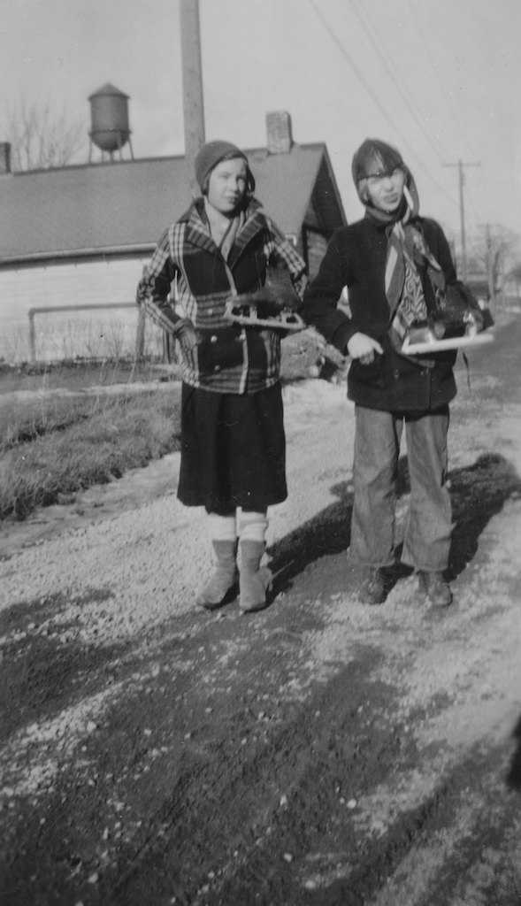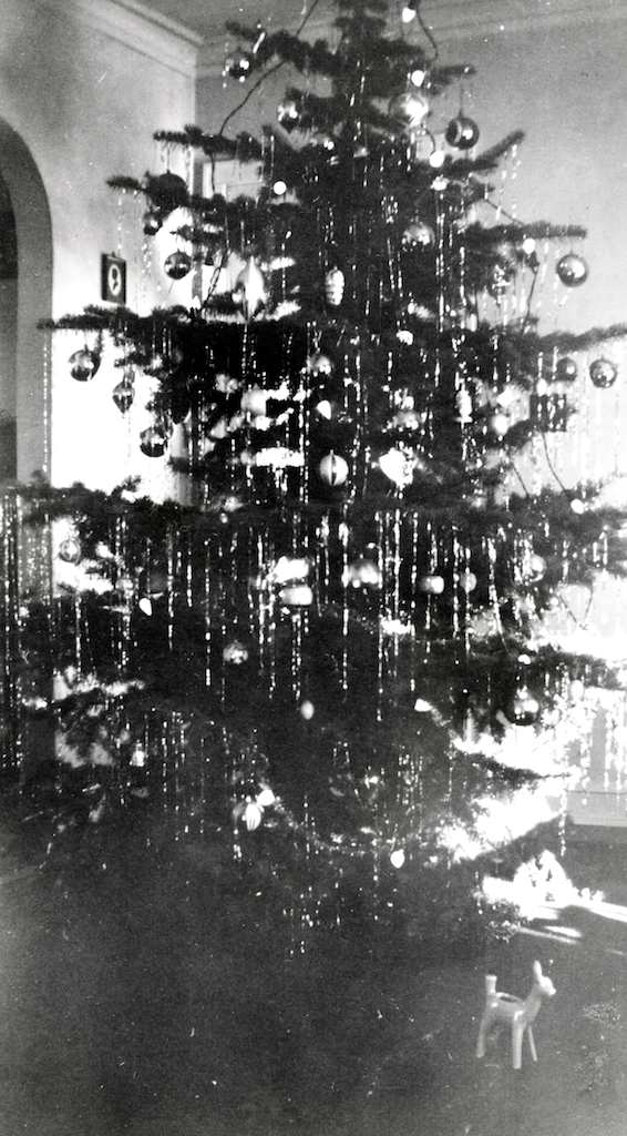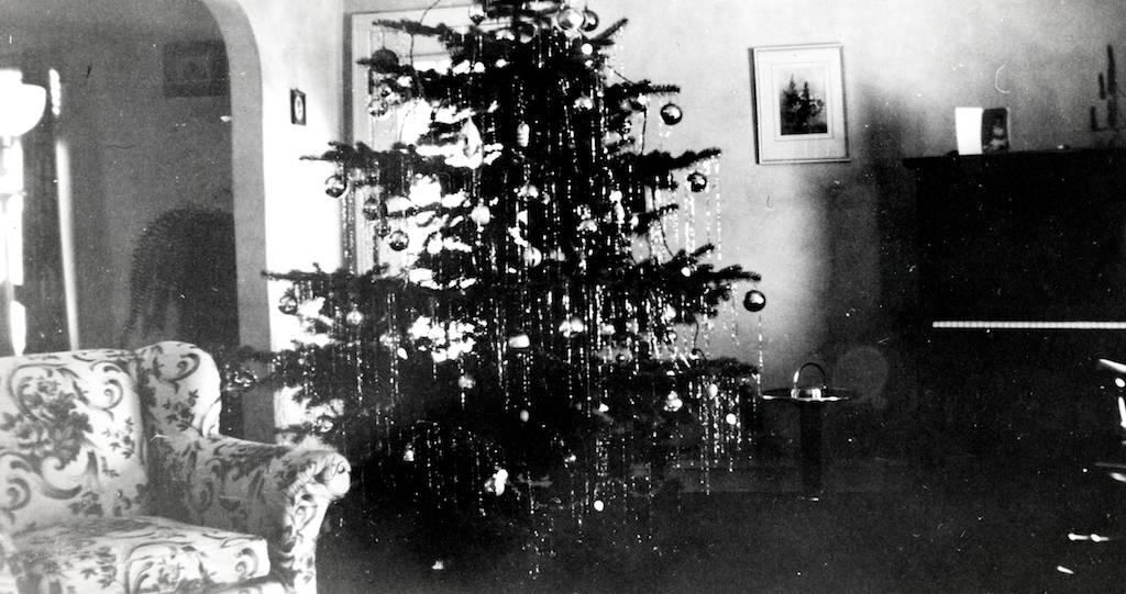 The upper left photo shows Ruth (on the right) with her cousin, Annette Maes. Although Annette lived in Marion, she and Ruth were very good friends through the years because Ruth took weekly train trips there to take piano lessons from Annette’s mother, Lil. Lil was Carl Sr.’s sister and had graduated from the Lawrence Conservatory of Music before her marriage. The two girls were skating near Ruth’s home in Kimberly. In 1943, Annette lived in Combined Locks when she was teaching there. She was Ruth’s maid of honor when she married. The upper right photo shows one of the Krieser Christmas Trees. You can see the silhouette of Carl Junior hanging on the wall. That had been a gift from his earlier school days. The bottom photo shows more of the Krieser’s living room including the piano that Ruth practiced on to the right. This is a rare peek inside of their lovely Kimberly home.