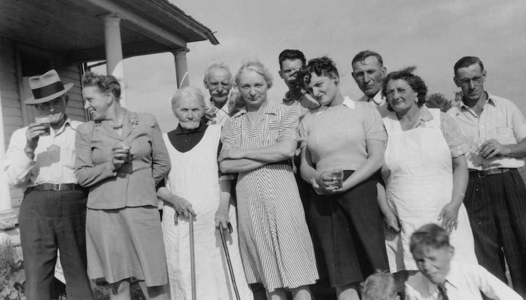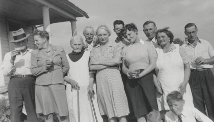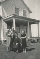 An undated snapshot. The date of this Bley family reunion can only be guessed - probably in the mid-1940s. Again, the picture is taken in front of the old Bley house. The home that they were raised in was the natural gathering place for these reunions. It says something about our desire to go back to our roots, our “home”. Most of the other siblings lived in the area. George lived right across the road in his new farm house, which probably had more room for everyone, but it wouldn’t have felt like “home” to the rest of the children who were raised in the old Bley farmhouse. Mary Ann and Jim Bley, the parents of this family, continued to live with their son, John P. Bley and his wife, Katherine, until their deaths. Mary Ann and Katherine look like the perfect homemakers in their crisp, white aprons. (Left to right): Frank McGuire, husband of Mary Bley, the oldest child in this family, Rose (Bley) Robertson, Mary Ann and Jim Bley, Anna (Bley) McGinnis, unidentified male, one of Anna’s daughters, John P. and Katherine Bley, George McIlhone (son of Mary Bley McIlhone McGuire), and Leon Robertson, son of Rose (Bley) Robertson, in front.