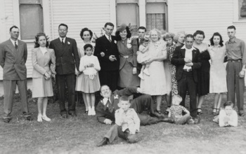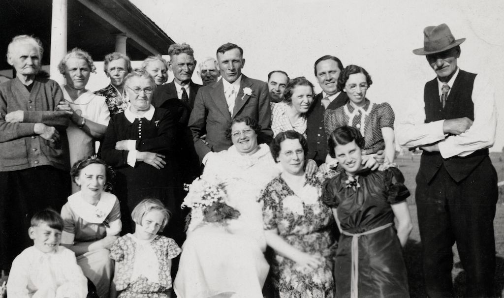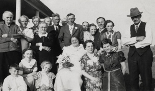 RIGHT: John P. Bley’s Wedding. On June 14, 1937, John P. Bley, son of James W. Bley, married Katherine O’Neil of Oconto, Wisconsin. This snapshot includes members from both of their families, so not all the people have been identified. Those from the Bley side include (standing): First two on the left, Mary Ann (McKeever) Bley and her daughter, Sarah (Bley) Cotter; 5th from left, Anna (Bley) McGinnis; center with the boutonniere is John P. Bley; next to him is his sister, Rose (Bley) Robertson and her brother-in-law, Michel O. Steenhoudt; James W. Bley, patriarch of the family stands at the right. Seated, left to right: Sara’s son, Joe Cotter; Collette McIlhone, daughter of Mary (Bley) McIlhone; Dorothy Cotter; and Katherine (O’Neil) Bley, the bride; the others in the picture are not identified.