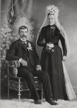 The above unmarked photograph was found among those that were taken from the old Bley farm after the death of Jim Bley’s son, John P. Bley. It seems safe to assume that it was Jim’s and Mary Ann’s wedding picture for the following reasons: 1) The photo came from their home; 2) Although their appearance had changed from aging through the years, they do have the same general features of Jim and Mary Ann Bley (see the picture on the next page of Jim and Mary Ann in their later years for comparison); 3) The photo was taken by the A. H. Matte Studio of Appleton, Wisconsin, the closest city to their farm; 4) The time period is right as seen in their clothing and the photo mounting. Women still wore black wedding dresses in the late 1800s.