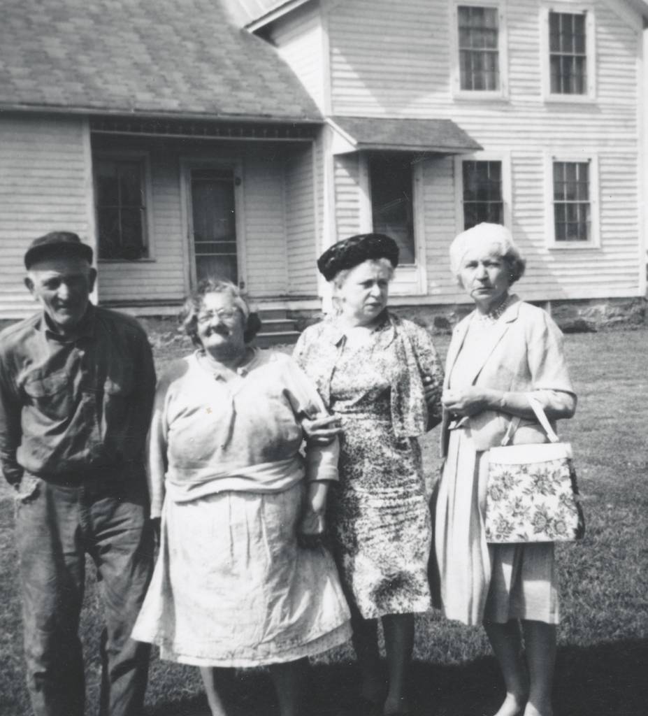 RIGHT: A four generation snap. This was a proud moment in the lives of the James W. Bley family. It was taken in recognition of the birth of their first great-grandchild. Again, they gathered on the lawn in front of the old Bley farmhouse to celebrate the event. Jim and Mary Ann had lost their first two children as infants, and Mary (Bley) McIlhone McGuire was their oldest surviving child. Everyone was full of smiles for the happy event. The baby is dressed in white. Perhaps it was the day of her christening. Mary (Bley) McIlhone McGuire is on the left, holding her new granddaughter, Patsy Oskey. She looks like a typical doting grandmother with her first grandchild. Jim and Mary Ann (McKeever) Bley, the great-grandparents, appear to be equally as proud. Mary Ann is dressed so stylishly in her black coat and hat, sitting so prim and proper on her chair. Colette (McIlhone) Oskey, mother of the baby, stands to the right. Colette was always a shy, tiny person, just a “slip of a girl” all her life. She never seemed to gain weight as most of us do as we grow older. One always worried that a strong breeze might blow her away, but she was a hard worker. The picture was probably taken in the mid-1930s.